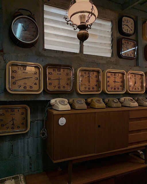 빈티지 시계는 모양과 숫자와 재질이 매력적인 디자인적 요소, 그리고 안정적이고 똑딱거리는 소리로 모든 공간에 개성과 세련미를 더해주는 중심이 됩니다. 빈티지 시계는 지나간 시대의 장인정신이 더욱 돋보이는 물품입니다. 복잡한 목공품과 다듬어진 놋쇠 악센트를 가진 맨틀 시계든 소용돌이 모양과 에나멜 디테일을 가진 섬세한 아르누보 벽시계든 각각의 작품은 제작자의 숙련된 기술력과 디테일에 대한 정성을 보여줍니다. 또한, 빈티지 시계는 깊은 역사를 가지고 있습니다. 그들은 시간의 경과를 증언하고 시간과 날짜와 해를 충실히 기록하고 있습니다. 빈티지 시계는 시간을 보는 실용성뿐만 아니라 장식성 또한 뛰어납니다. 시공을 초월한 아름다움으로 중심적인 작품이 되거나 벽난로나 선반이나 벽을 장식하기도 합니다. 바늘의 우아한 움직임을 동반한 안정된 틱톡은 우리의 바쁜 삶에 편안함을 주는 치유의 시각적·청각적 경험이 되기도 합니다. 검정색 로터리 전화기를 황학동 벼룩시장에서 구입하여 서재방 낮은 책장 위에 두었더니 원목과 검정색이 아주 잘 어울립니다. 요즘의 제품과 달리 빈티지 전화기는 그 재료의 무게감이 상당하여 또 다른 깊이감 있는 매력이 있습니다. 검정색 전화기가 놓인 서재방은 감성을 자극하는 디자인공간이 되었습니다.